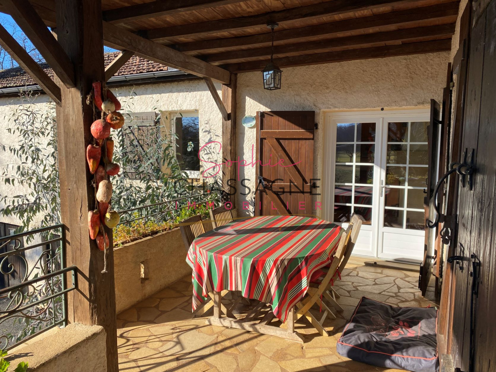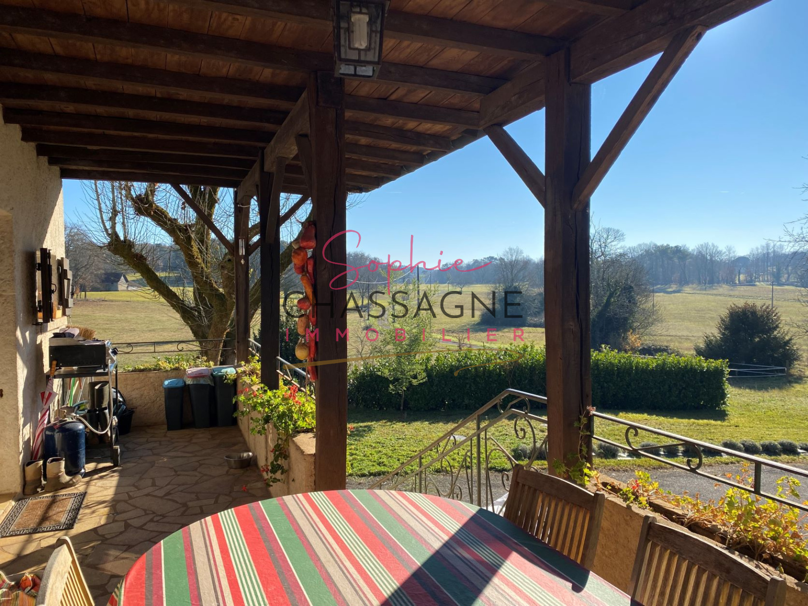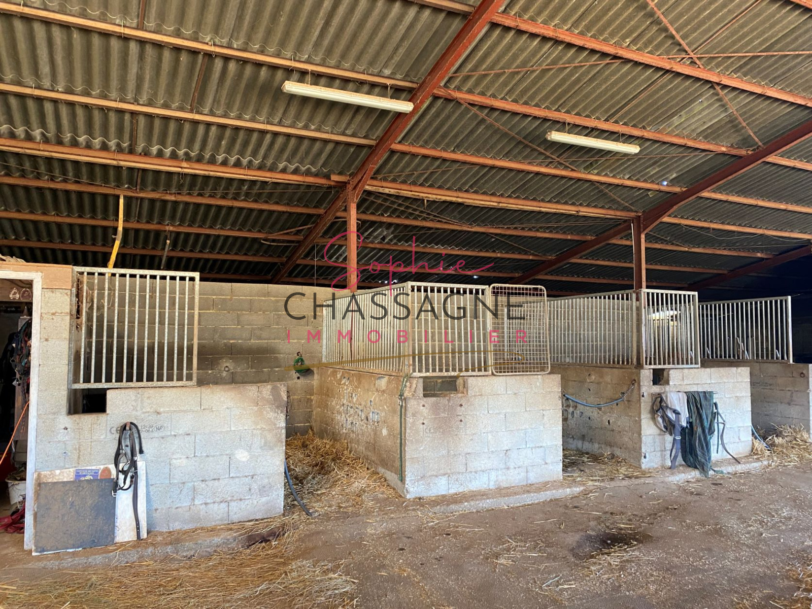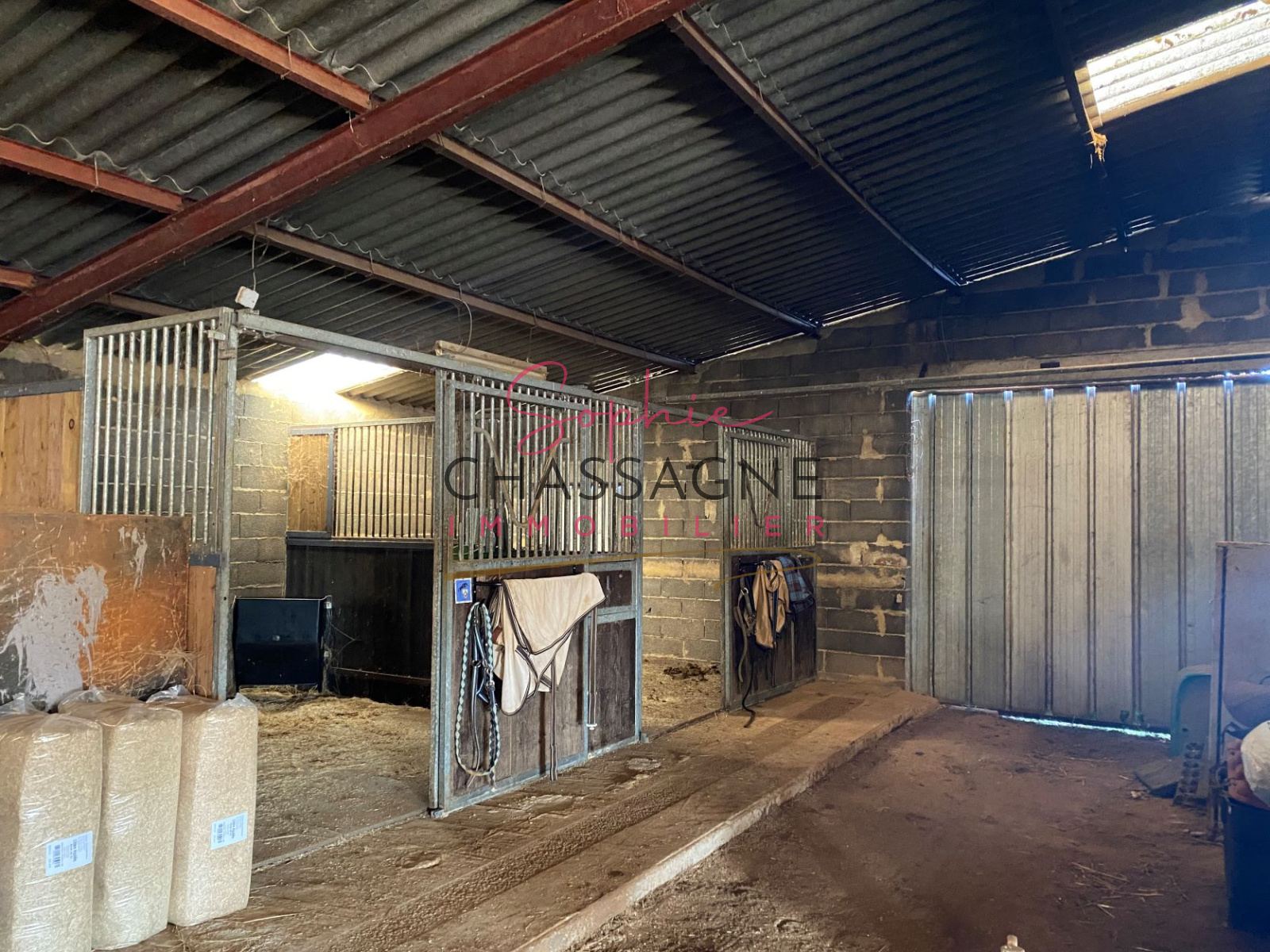 - Un hangar de 1000 m² avec panneaux solaire 9 kw/h (revenu de 2500 € annuel) composé de 5 boxes, d'une sellerie, d'une aire de pansage et d'une graineterie.