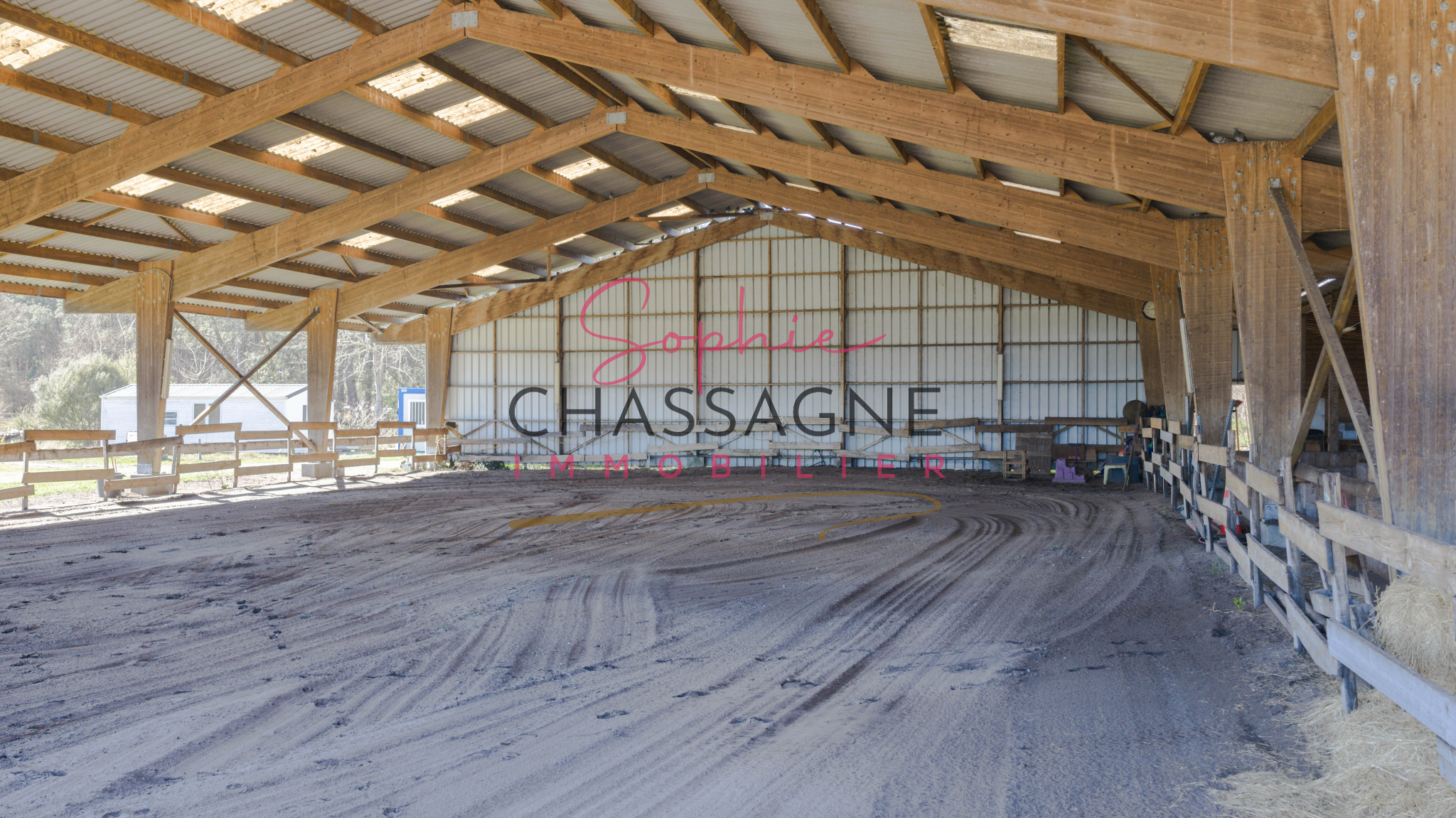 - carrière de 60 × 20 m en sable naturel, partiellement couverte avec manège de 30 × 30 m éclairé,