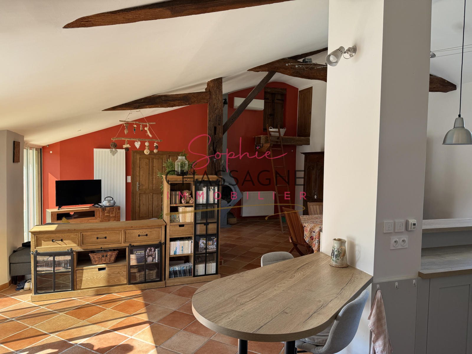 Une vaste pièce de vie de 72 m² avec cuisine équipée et aménagée, salon avec poêle à bois, espace repas, le tout climatisé