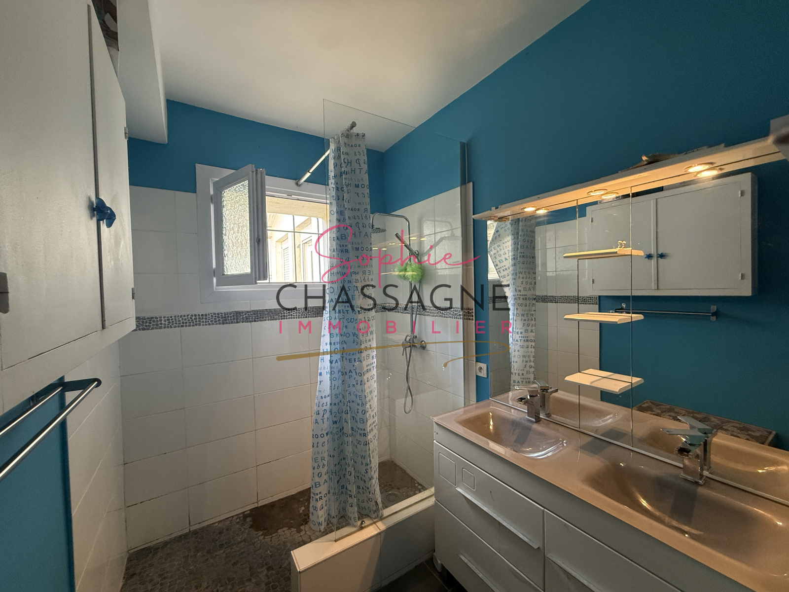 un bureau, une cuisine aménagée et équipée avec espace repas, un cellier, un salon / séjour lumineux ouvrant sur la piscine, une chambre avec salle de bains et WC, un dégagement, un bureau, une chambre, une salle d’eau, un WC indépendant et un atelier peinture.